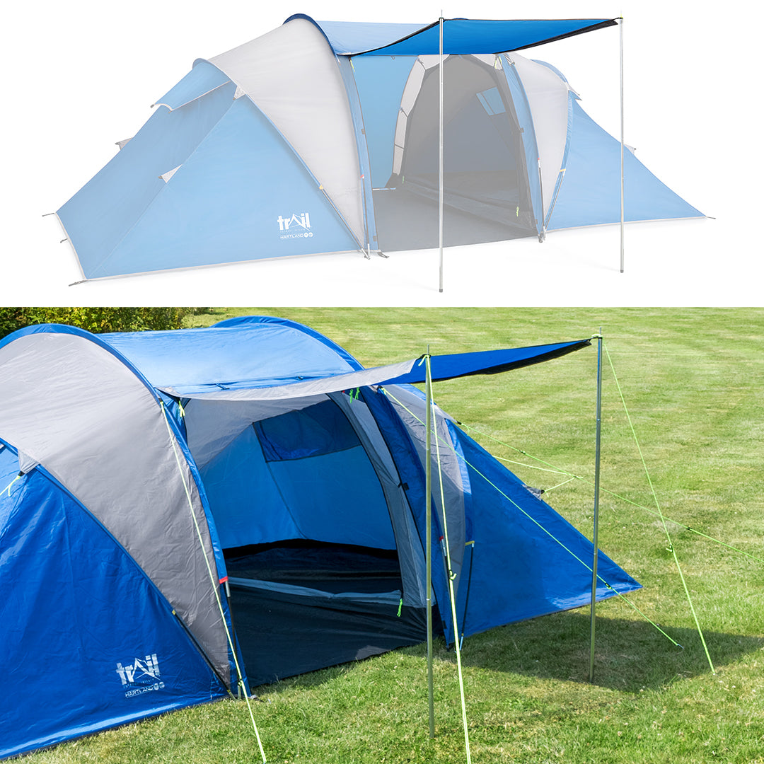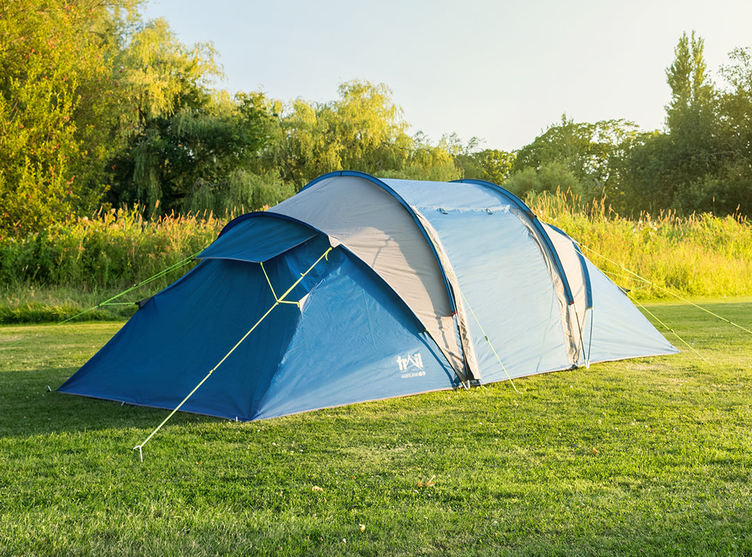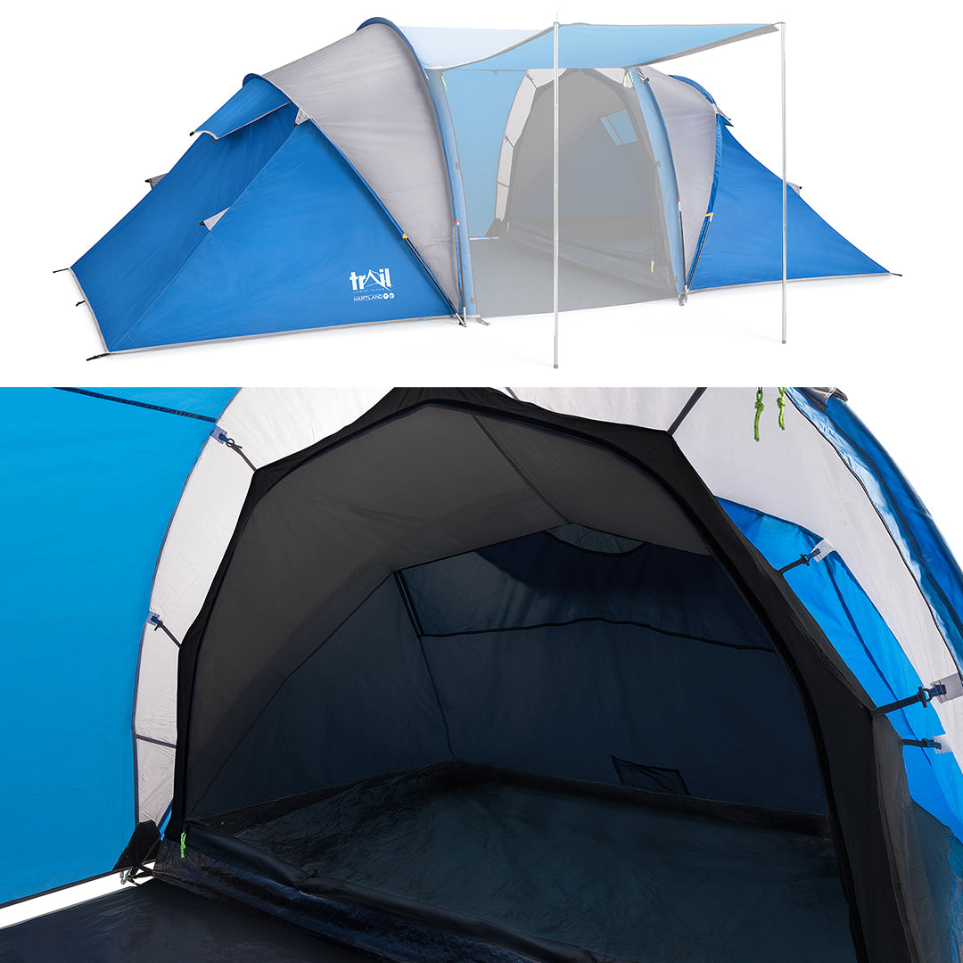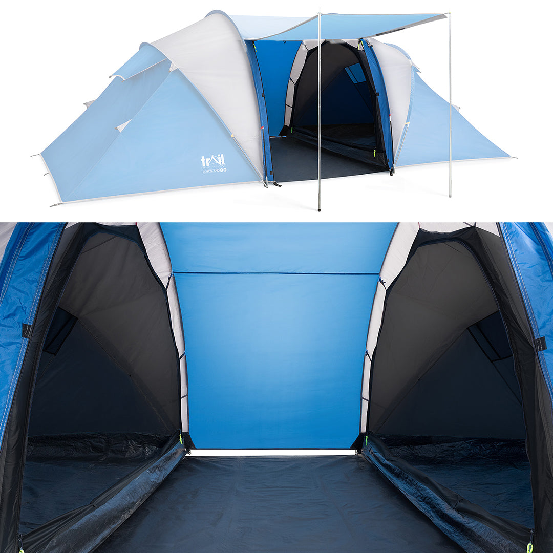 - Easy-pitch Tunnel Tent measures L420cm x W210cm x H140/115cm with 2 bedrooms and communal area (comfortably sleeps 4 people, 2 per bedroom).
