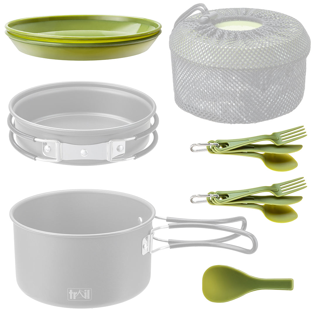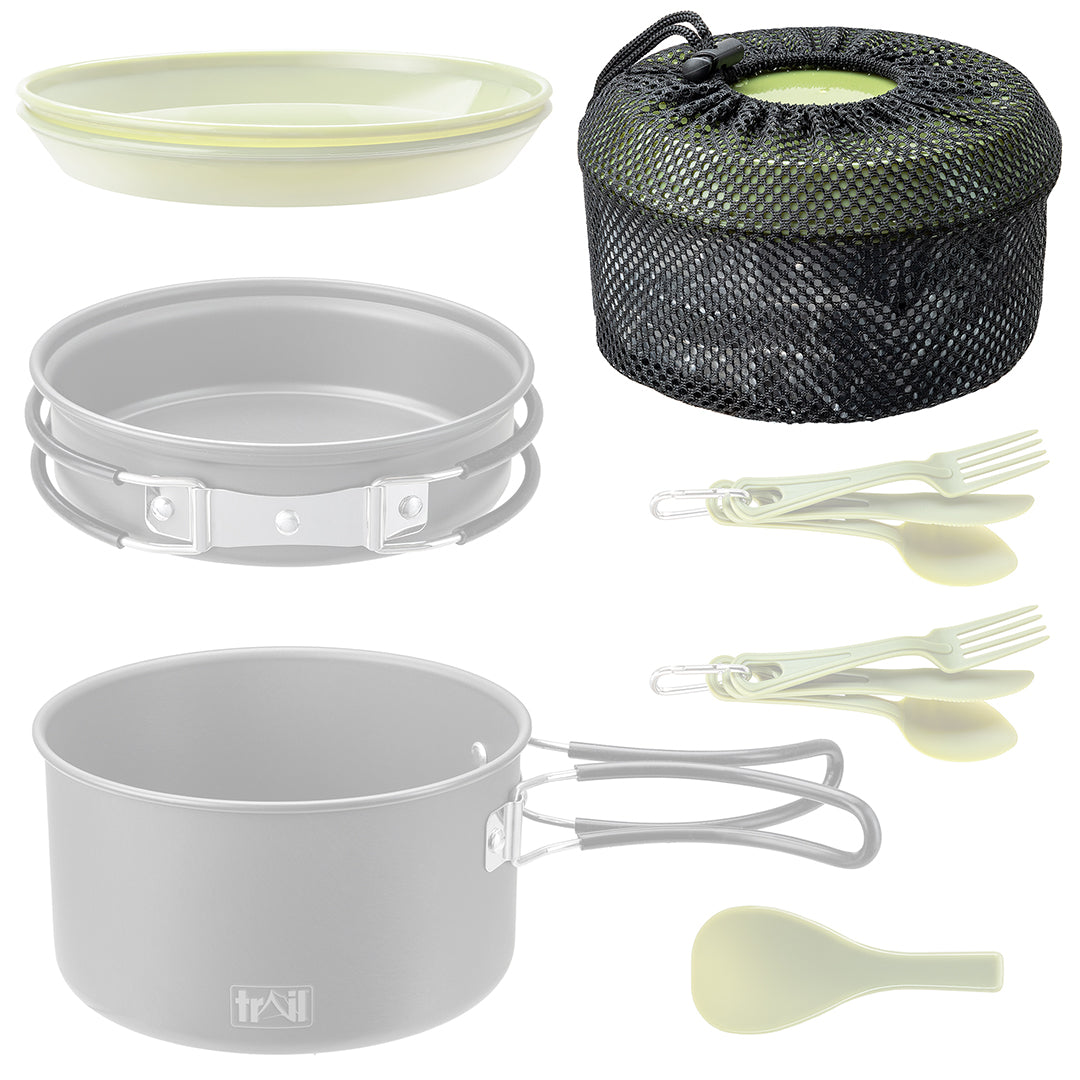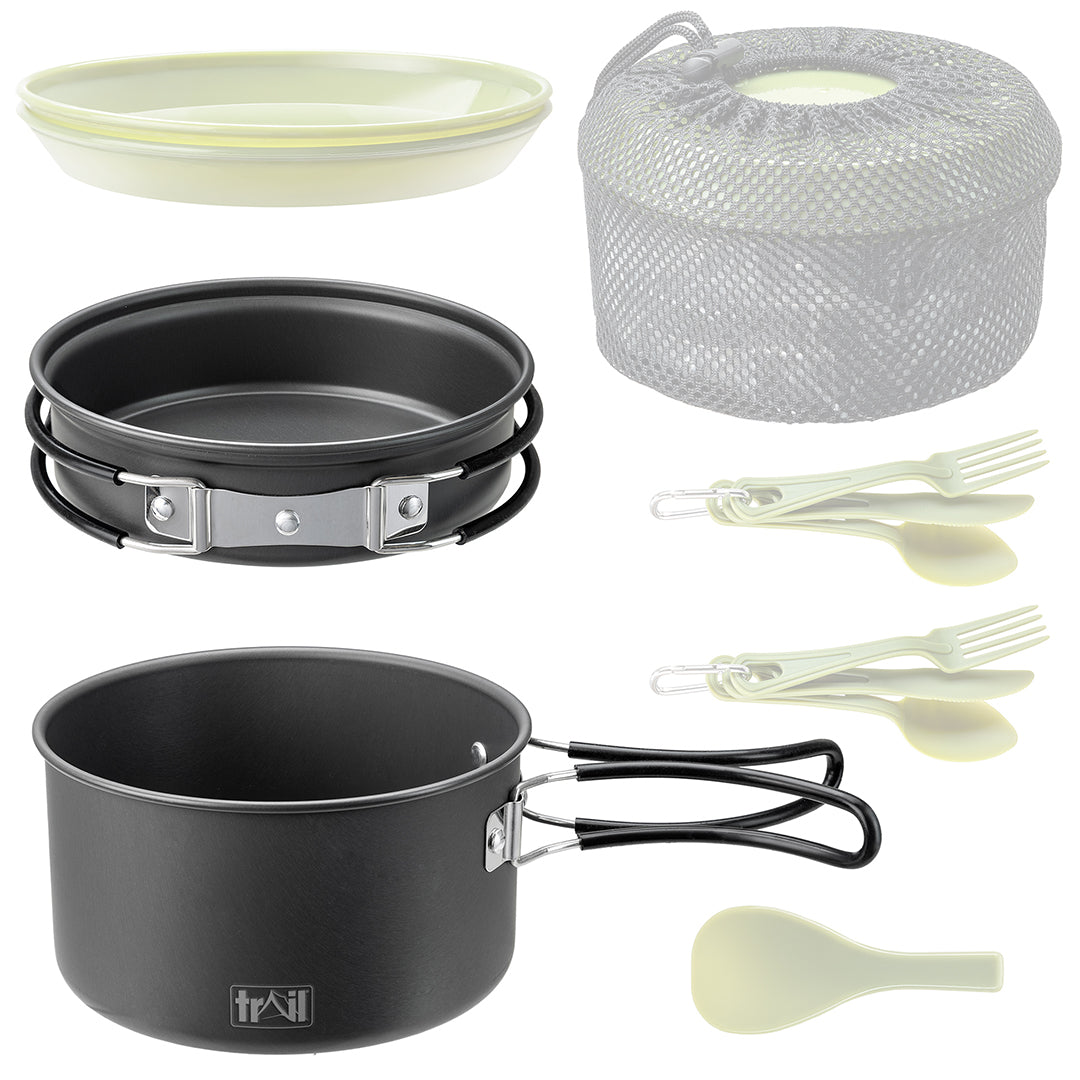 - 10pc set has everything you need to cook and serve a meal for two. Stacks into a compact size for easy storage with a mesh bag to easily carry (weighs 0.39kg).