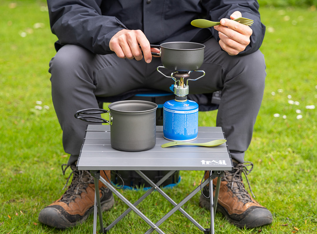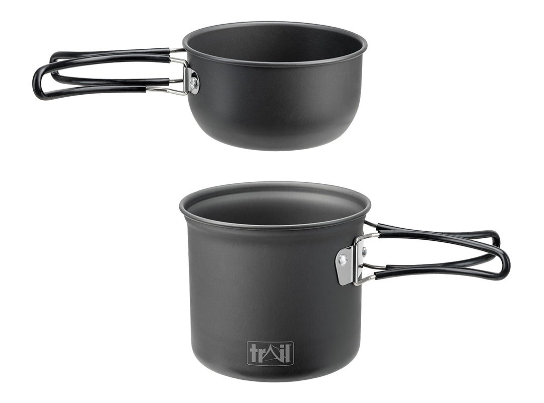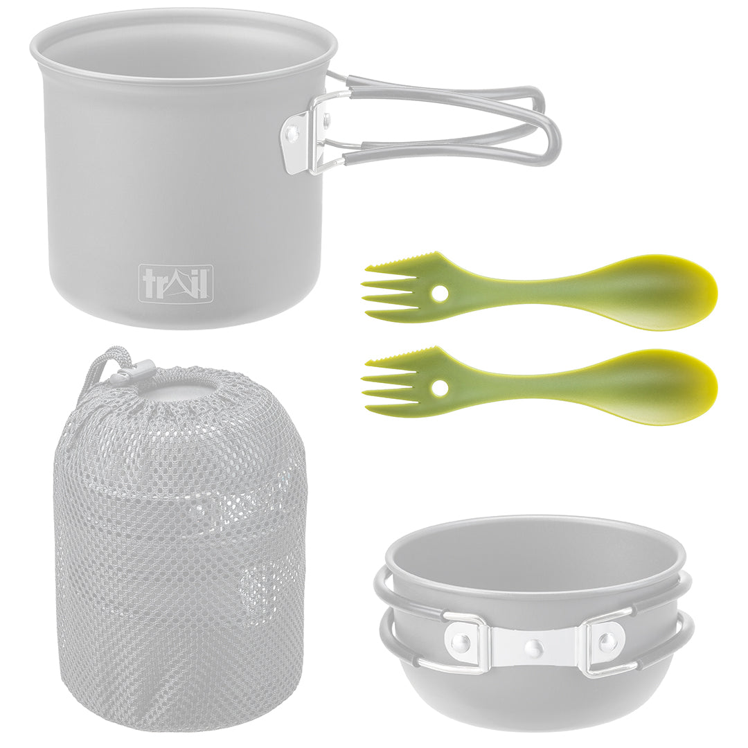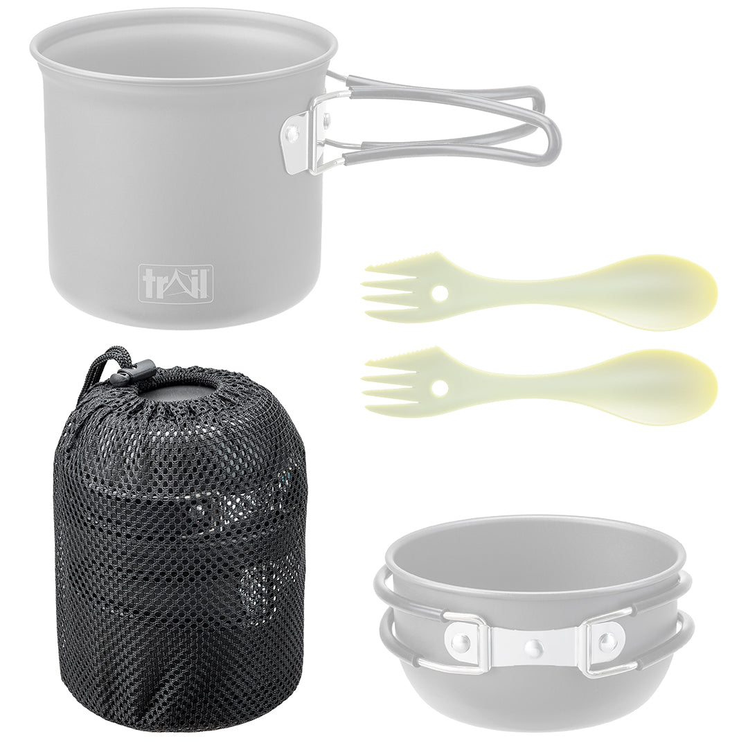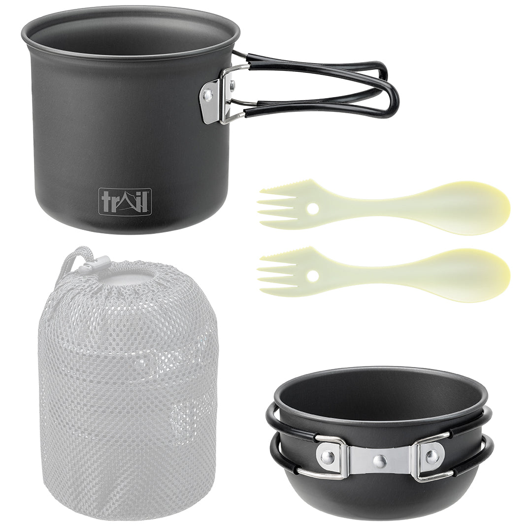 - 4pc cooking set is perfect for lone campers and cooking meals for two. Stacks into a compact size for easy storage with a mesh bag to easily carry (weighs 0.26kg).