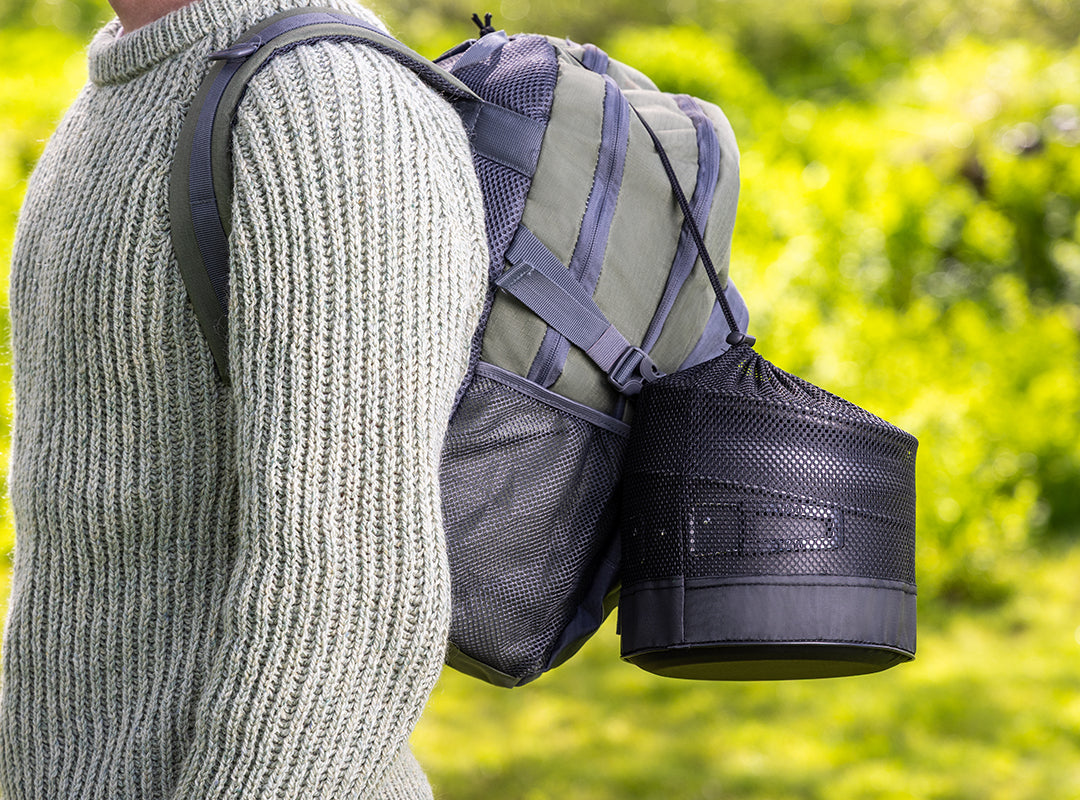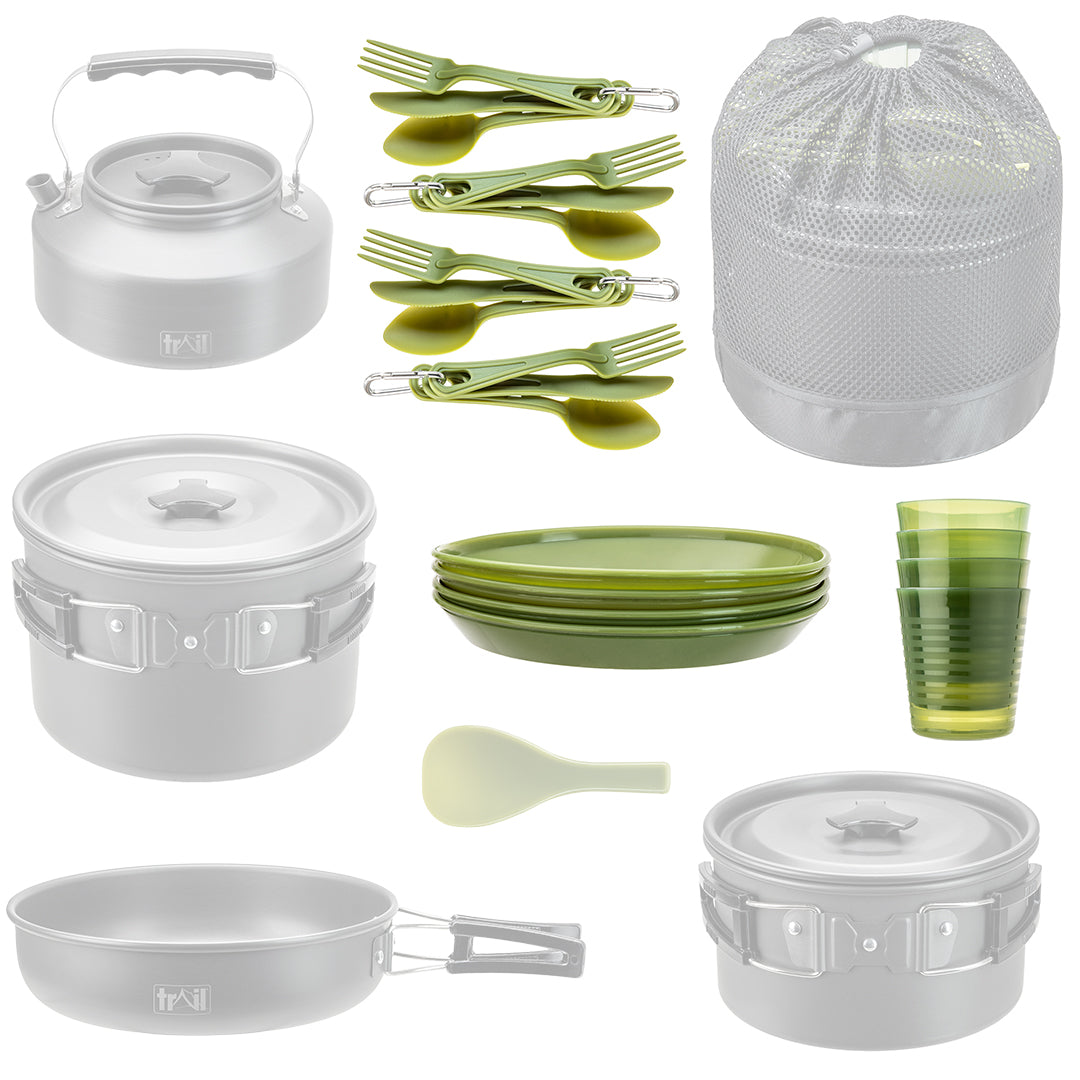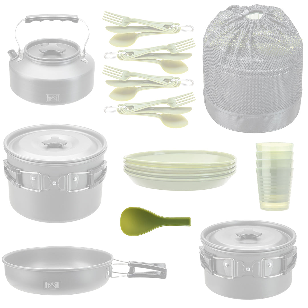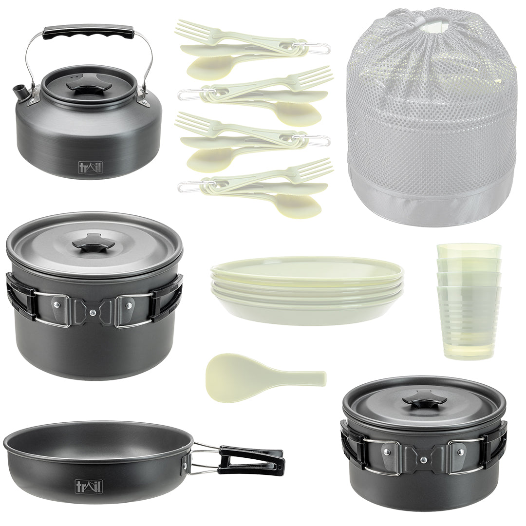 - 27pc set has everything you need to cook and serve a meal for four. Stacks into a compact size for easy storage with a mesh bag to easily carry (weighs 1.35kg).