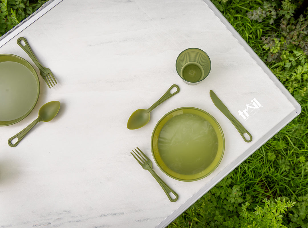 - Includes 4 plates (17.2cm x 2cm), 4 cups (7.6cm x 8.4cm), and 4 cutlery sets (knife, fork, spoon). Plus, a spatula to flip and stir food when you're cooking.