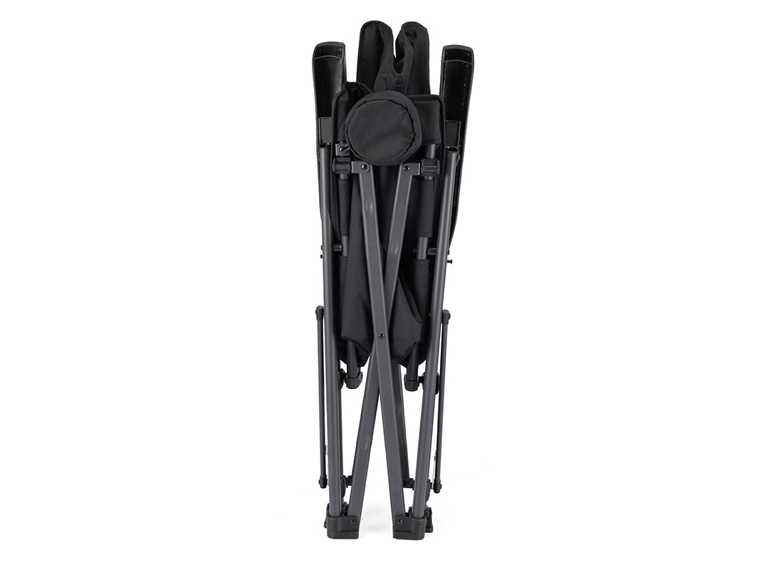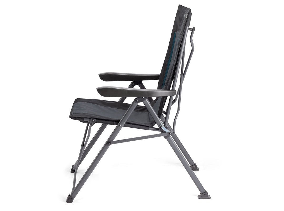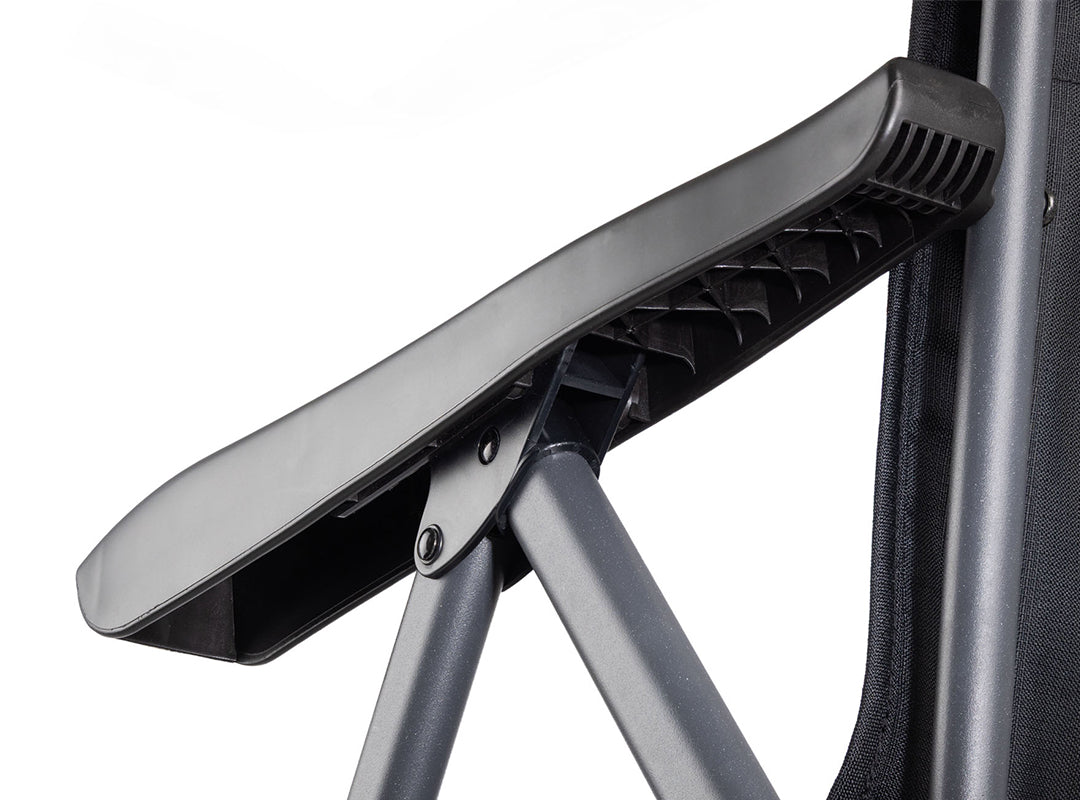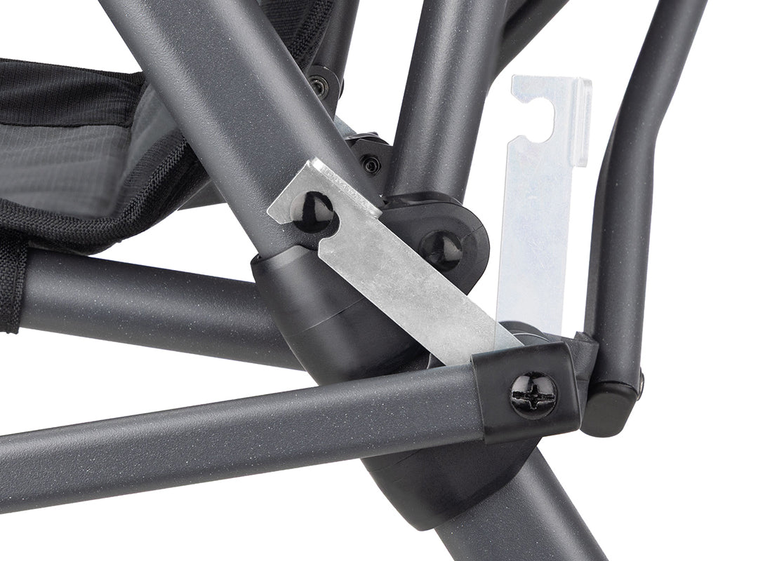 - Steel and aluminium frame delivers excellent strength and stability while remaining lightweight. Locking devices on each side keep the chair secure when fully open.