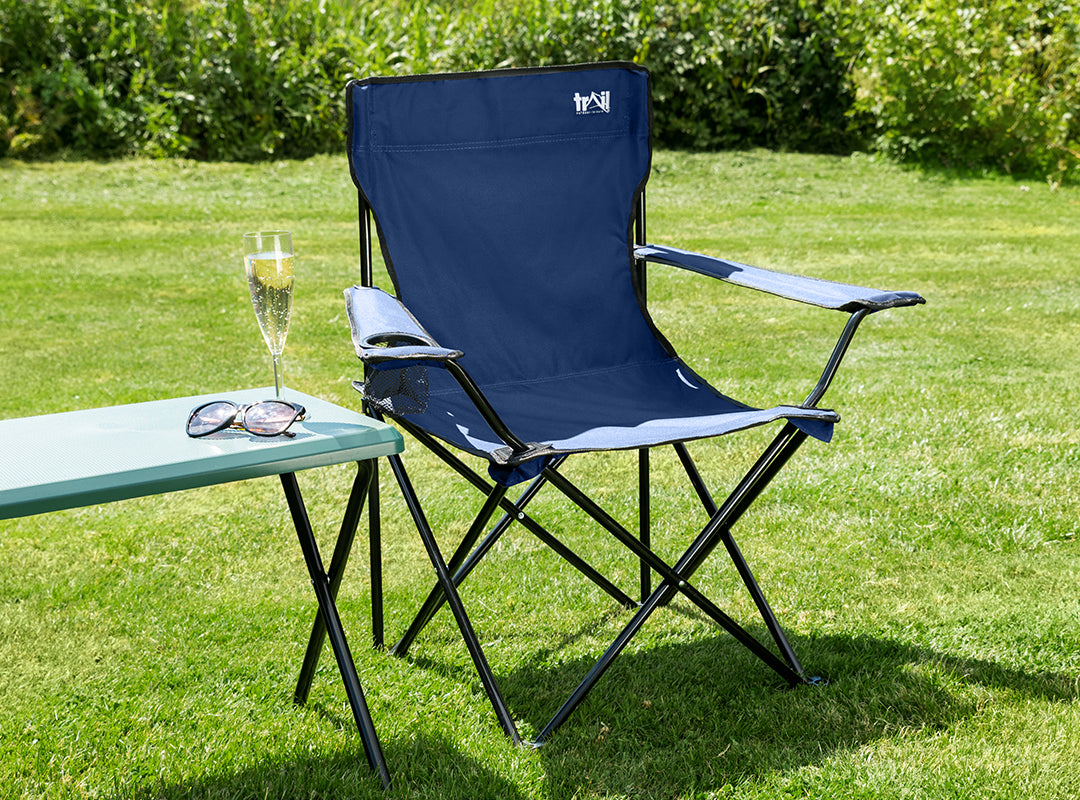 - Durable canvas-style polyester seat with wide armrests for support and comfort (easy to clean with a damp cloth when dirty).