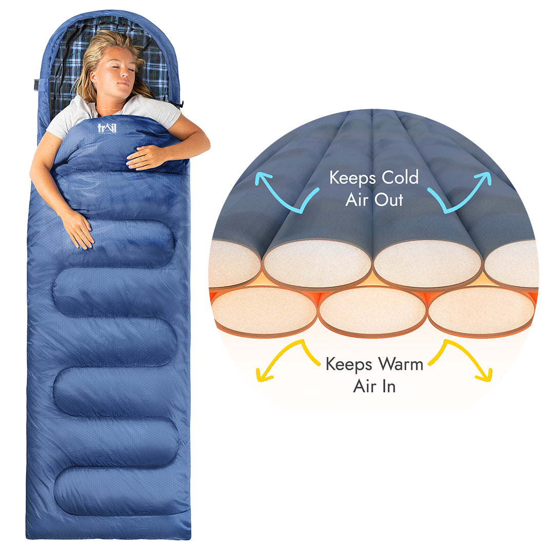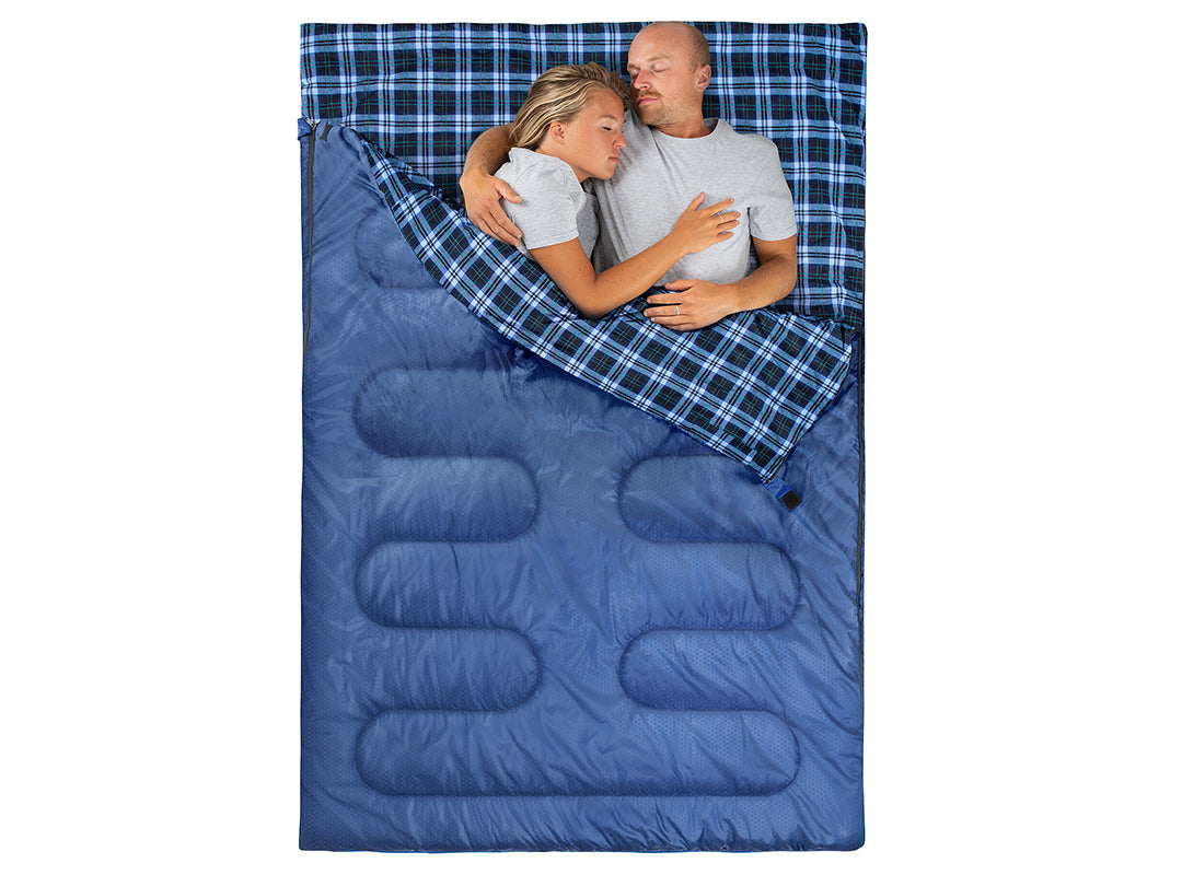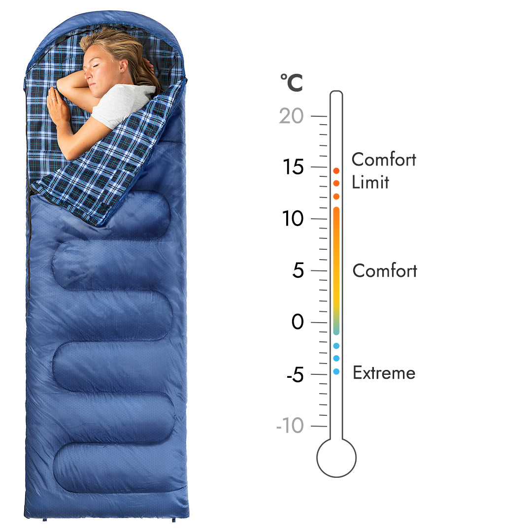 - Double-quilted filling is offset stitched for extra warmth and insulation (helps to prevent cold air infiltrating the sleeping bag and body heat escaping).