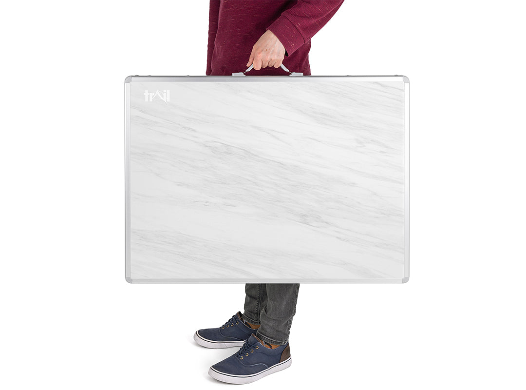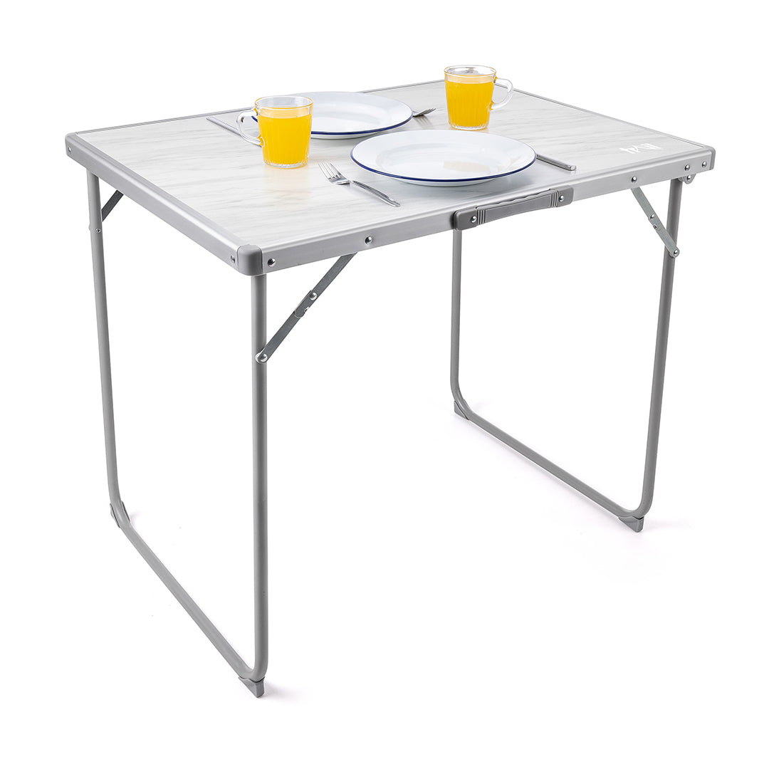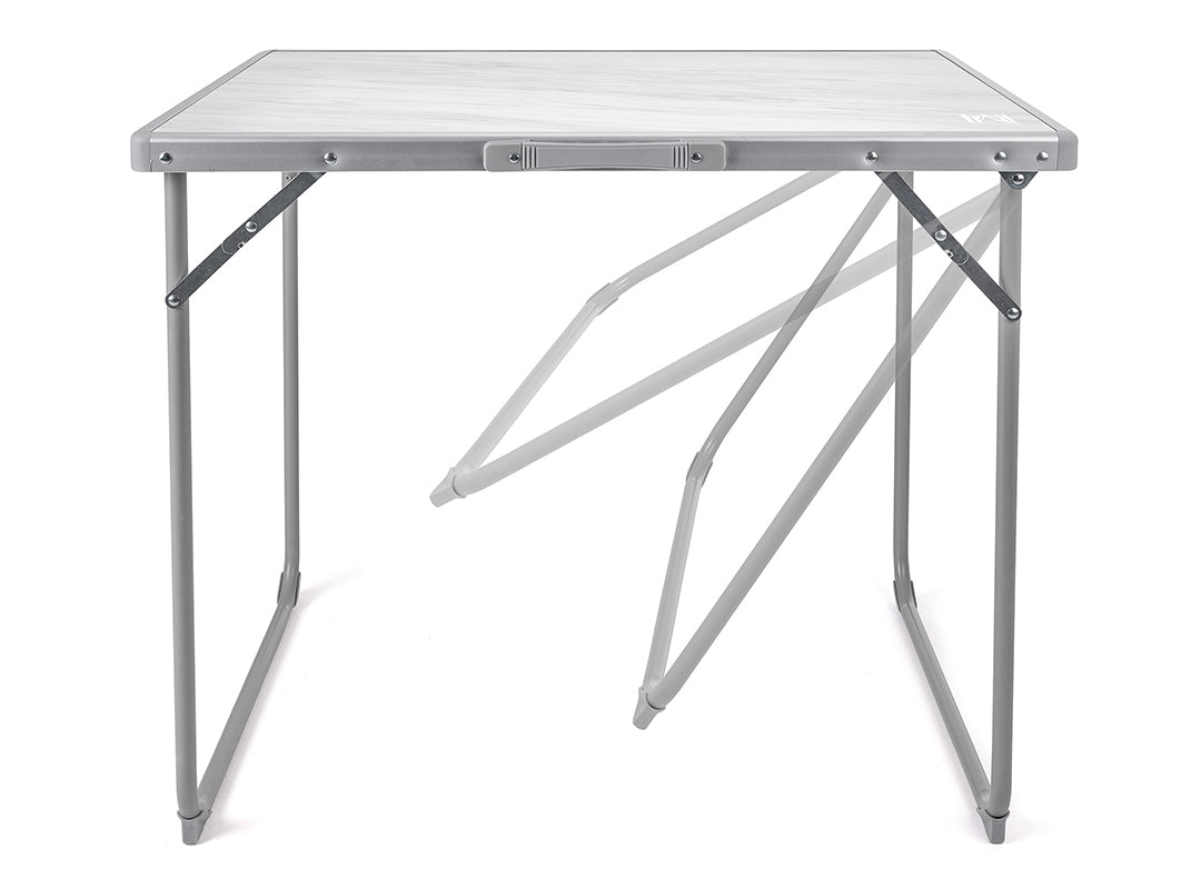 - Designed with a nylon handle on the side to comfortably carry when folded away (table measures 80cm x 60cm x 8cm and weighs 3.5kg when folded).
