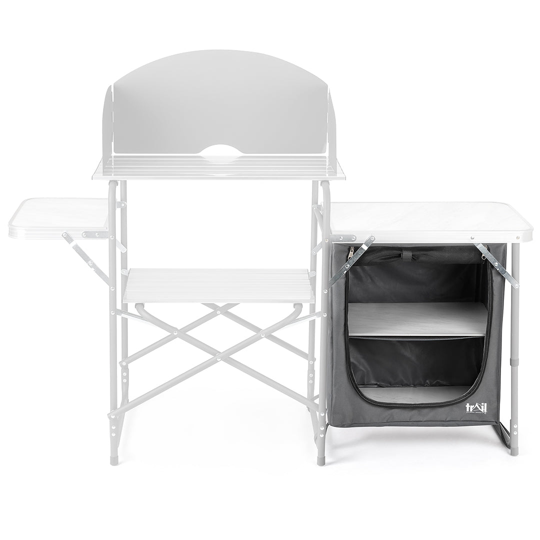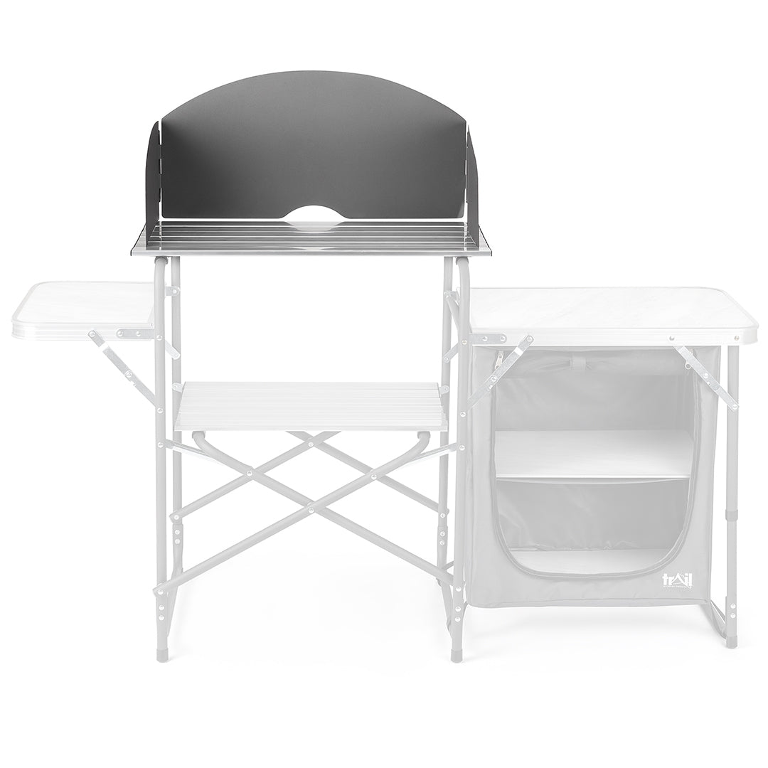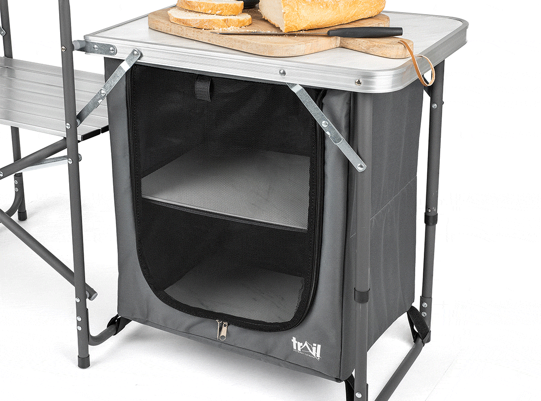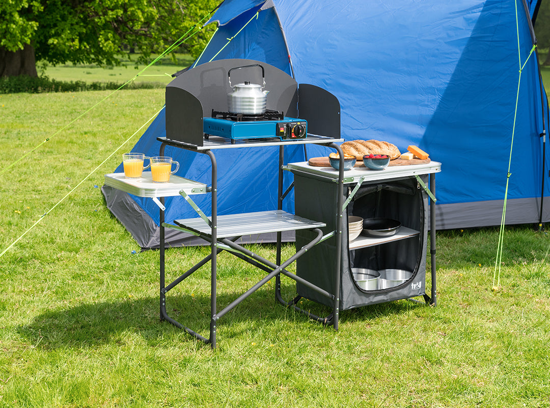 - Reinforced aluminium stove shelf is strong enough to take a double camping stove (features a clip-on windshield to shield the flames, plus a lower storage shelf).