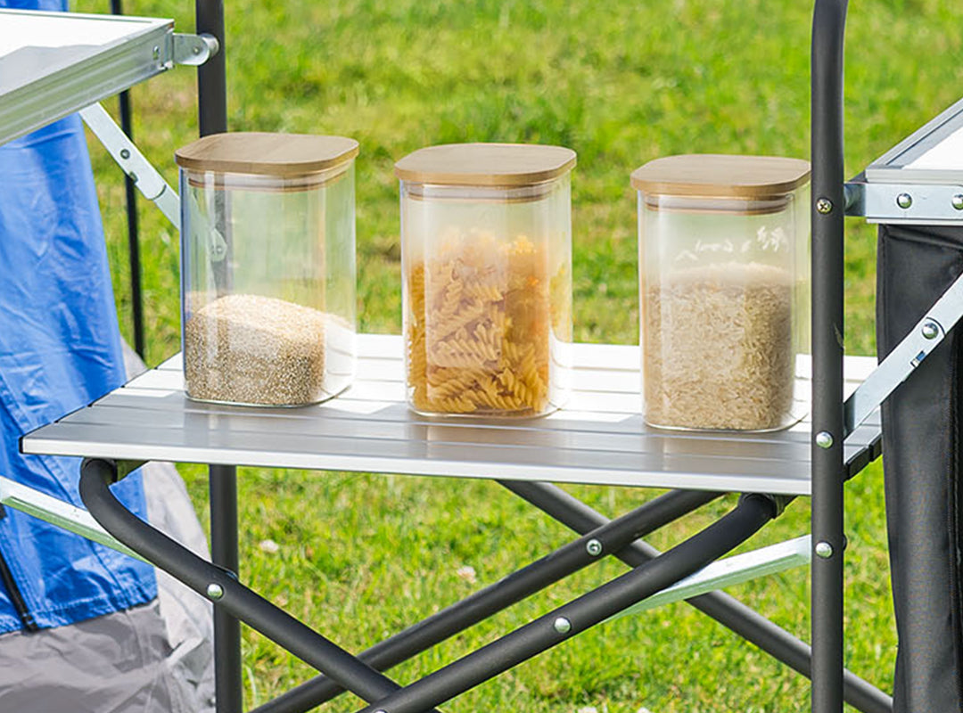 - Folding Camping Kitchen Stand with stove shelf, side cupboard, and folding side table (measures H110cm x W146cm x D46cm with 30kg weight capacity).