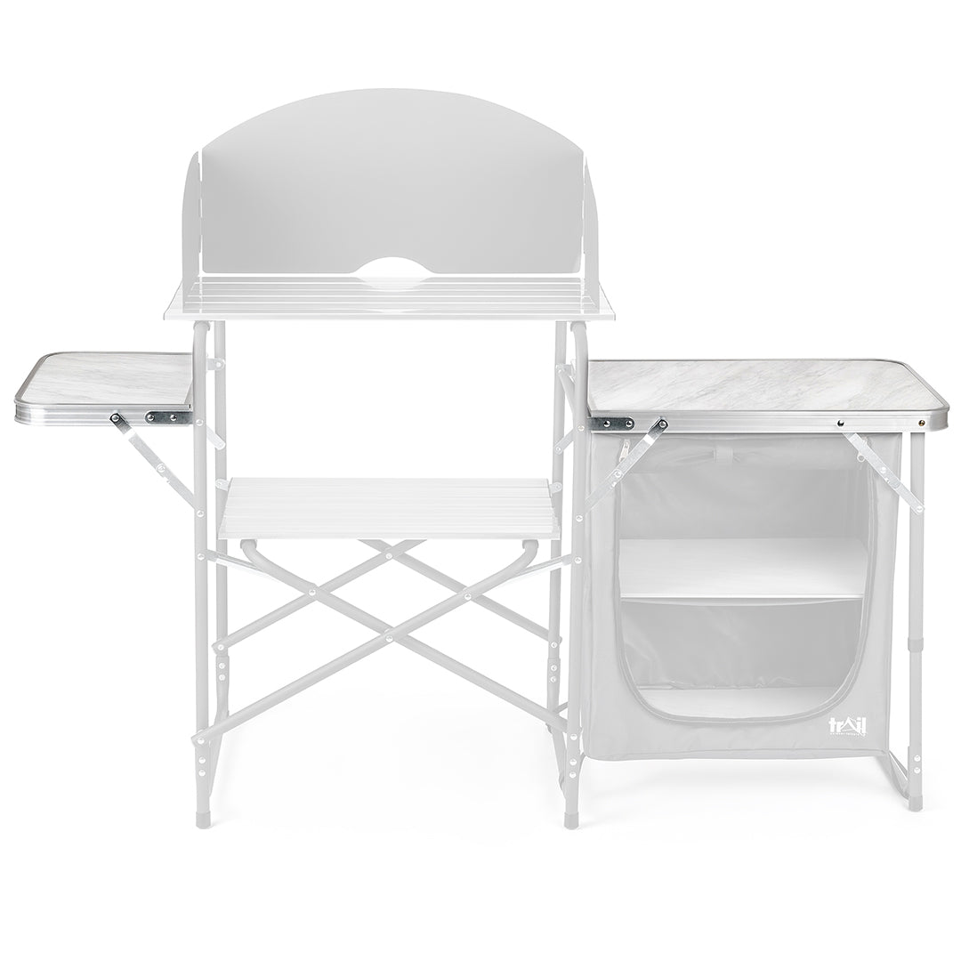 - Folding side table for cooking essentials, plus side storage cupboard with 2 shelves and worktop (made from durable MDF with a wipe-clean laminate surface).