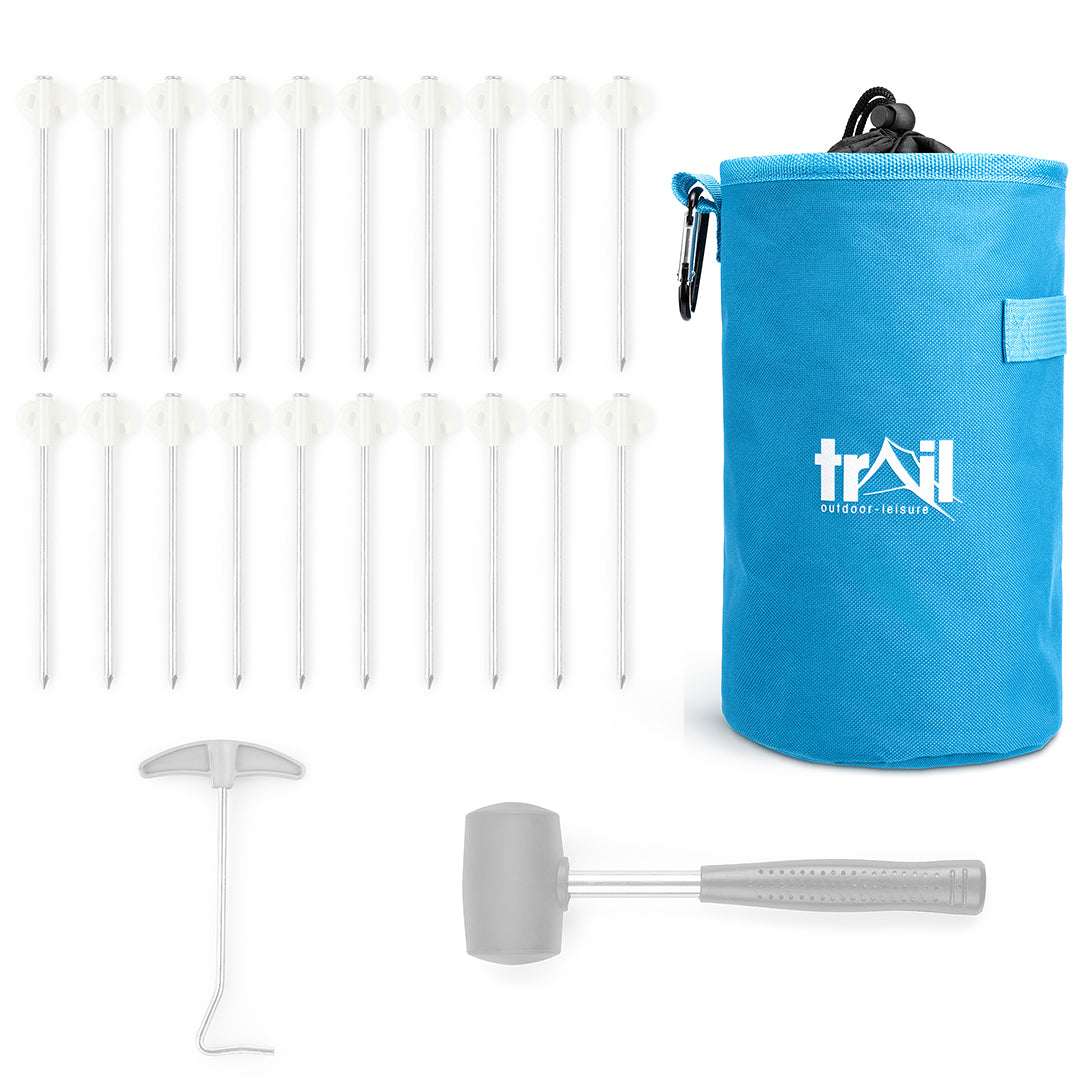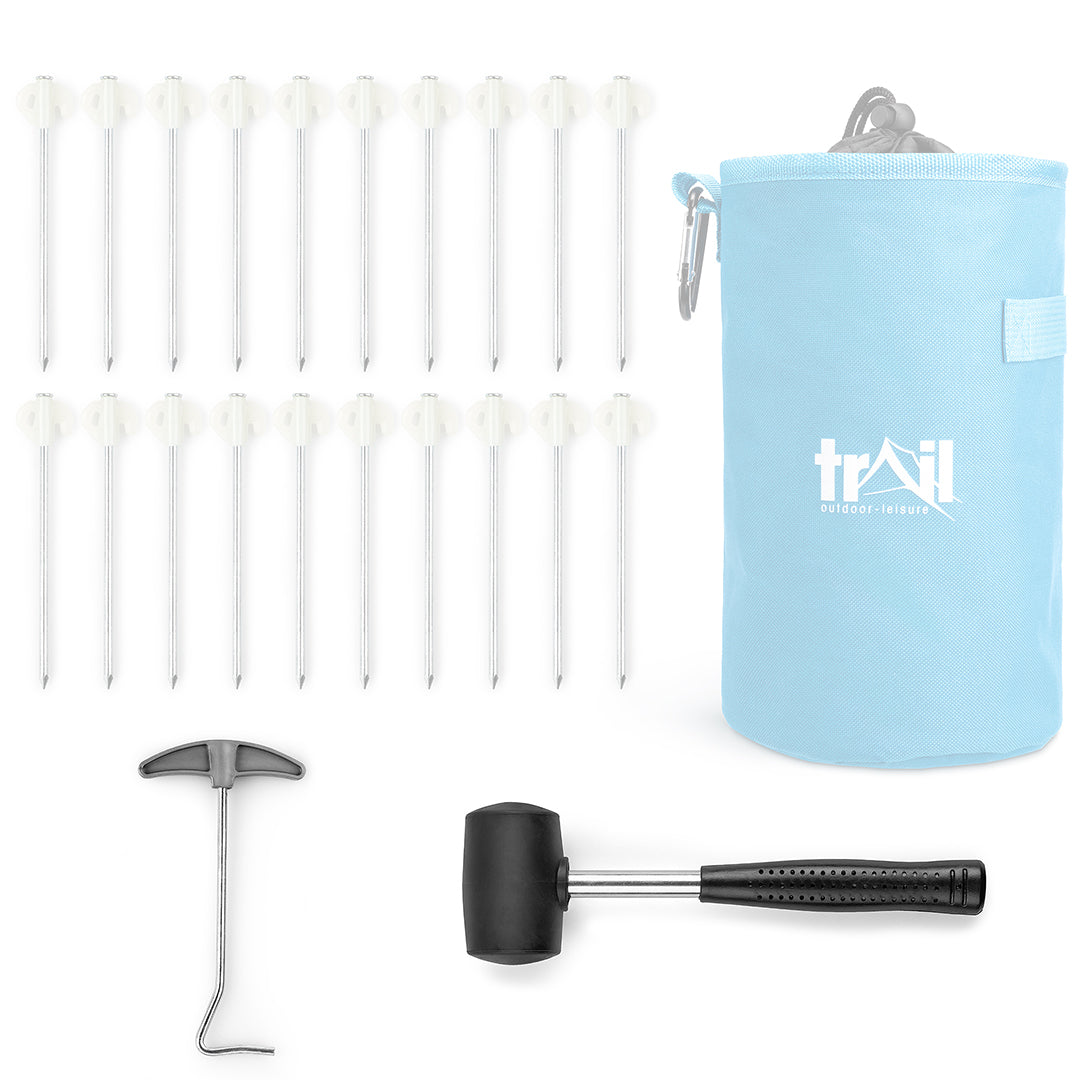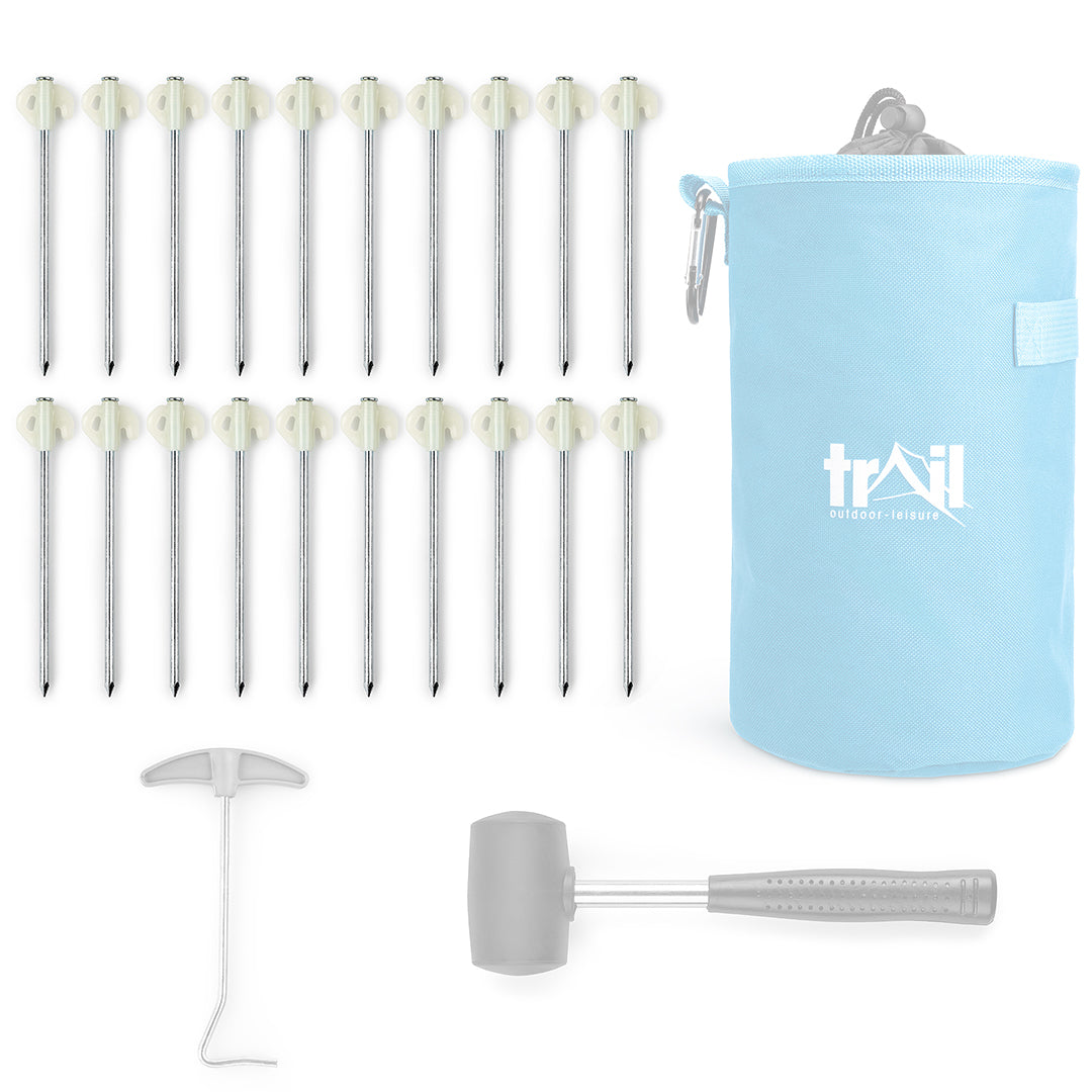 - 20 x Glow In The Dark Tent Pegs (extra-thick for harder ground with glow in the dark heads to easily locate your tent at night).