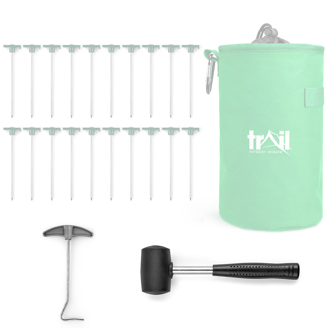 - 20 x Hard Ground Tent Pegs (extra-thick to easily penetrate harder ground and provide superior strength and holding power).