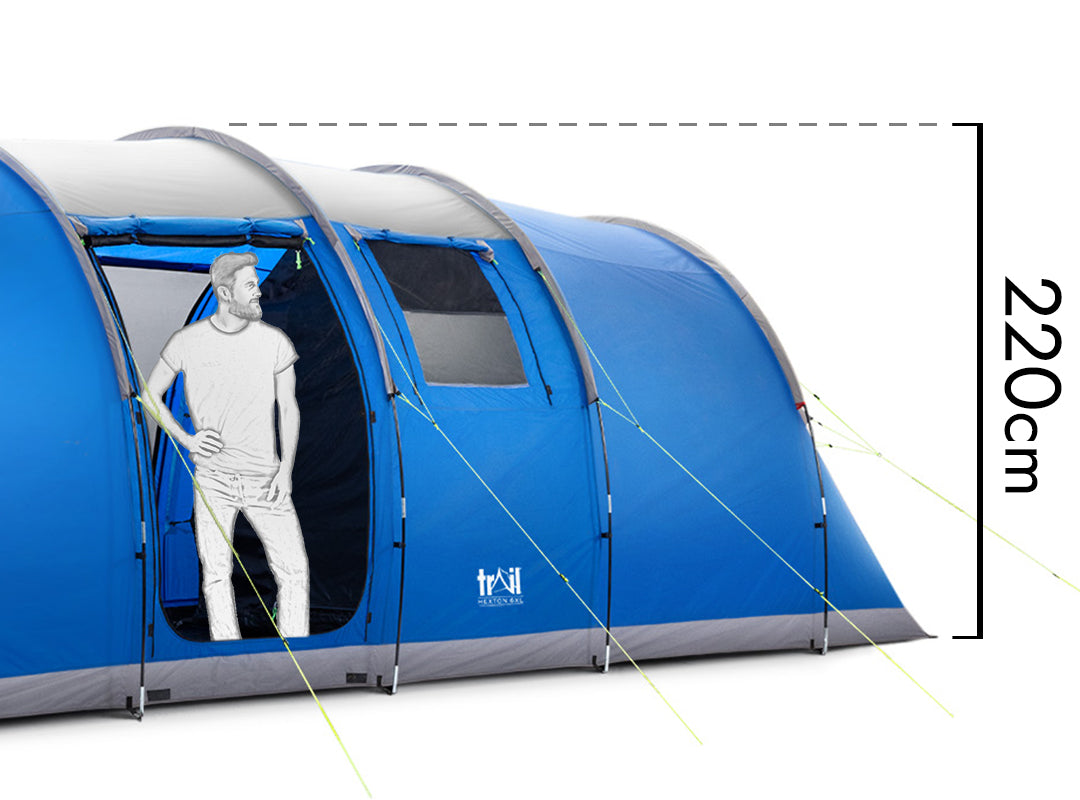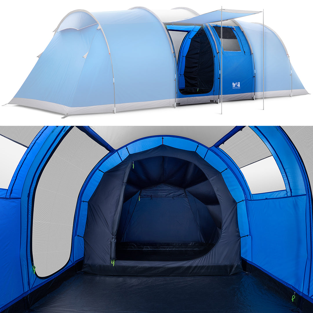 - Extra-Large 6 person tent measures L700cm x W240cm x H200/220cm with living area and 2 oversized bedrooms (each room sleeps 3 people, but can sleep 4 at a squeeze).