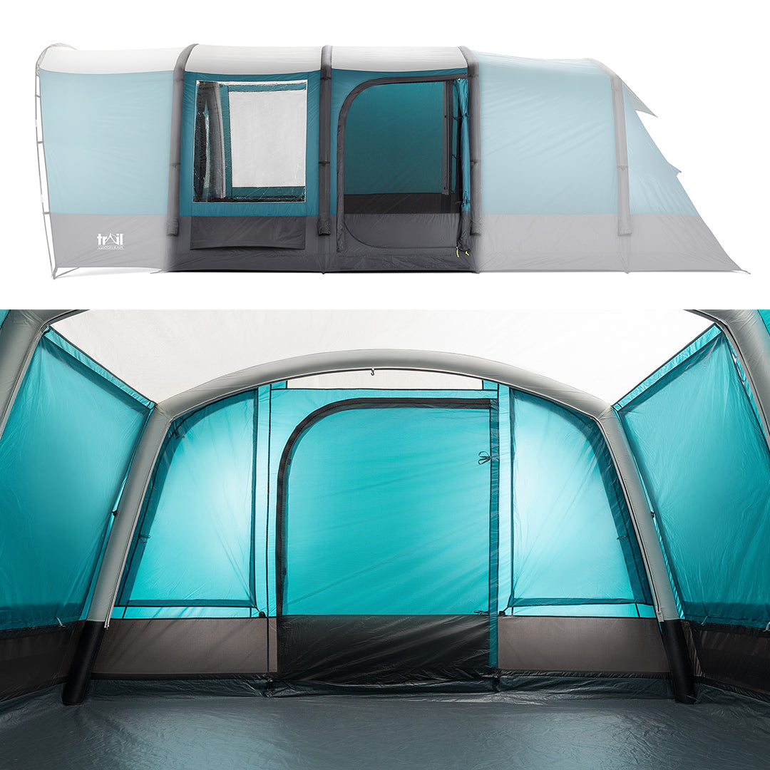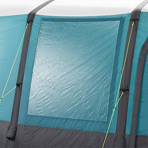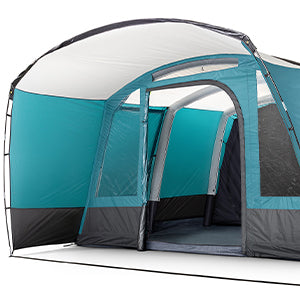 - Living area features sewn-in groundsheet, 2 entrances, front and side windows, lantern hook, cable access, and vent system (measures L280cm x W380cm x H210cm).