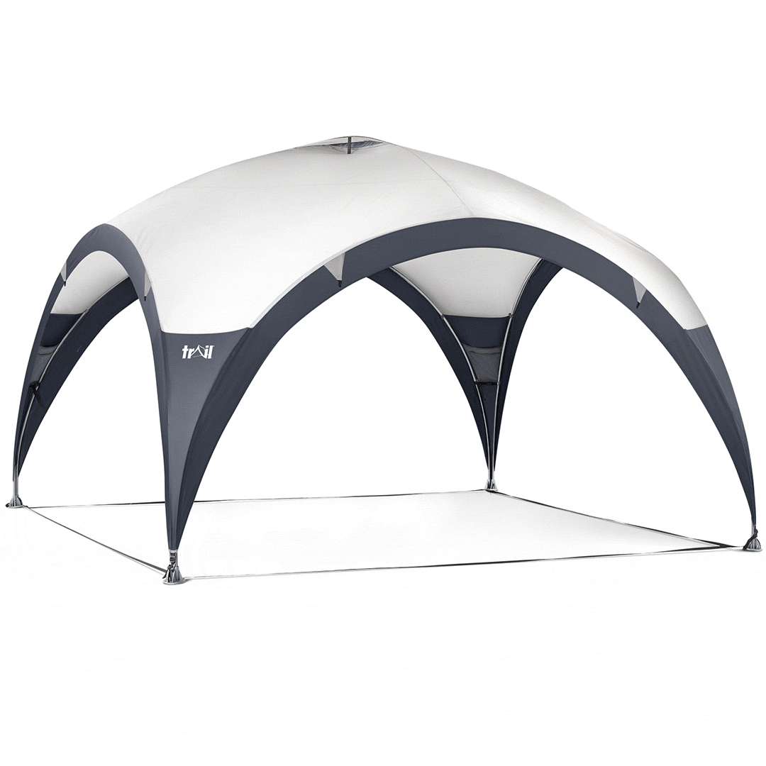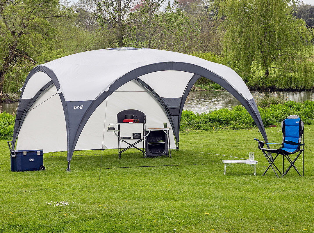 - Easy to pitch with cross-over poles and roof poles to provide plenty of height and space. Available in Large (3.5m x 3.5m x 2.25m) or Extra-Large (4.5m x 4.5m x 2.25m).