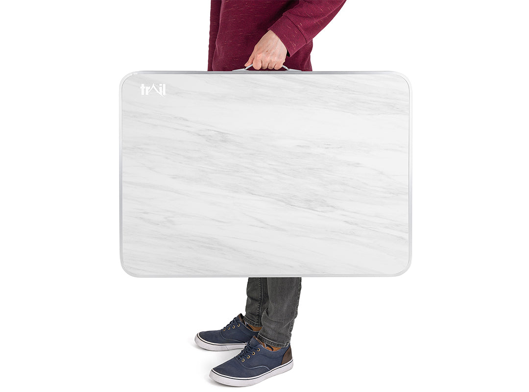 - Designed with a nylon handle on the side to comfortably carry when folded away (table measures 60cm x 60cm x 0.5cm and weighs 5.6kg when folded).