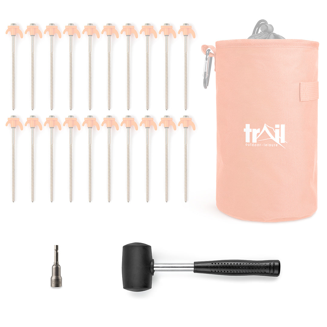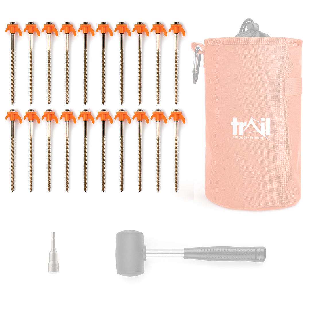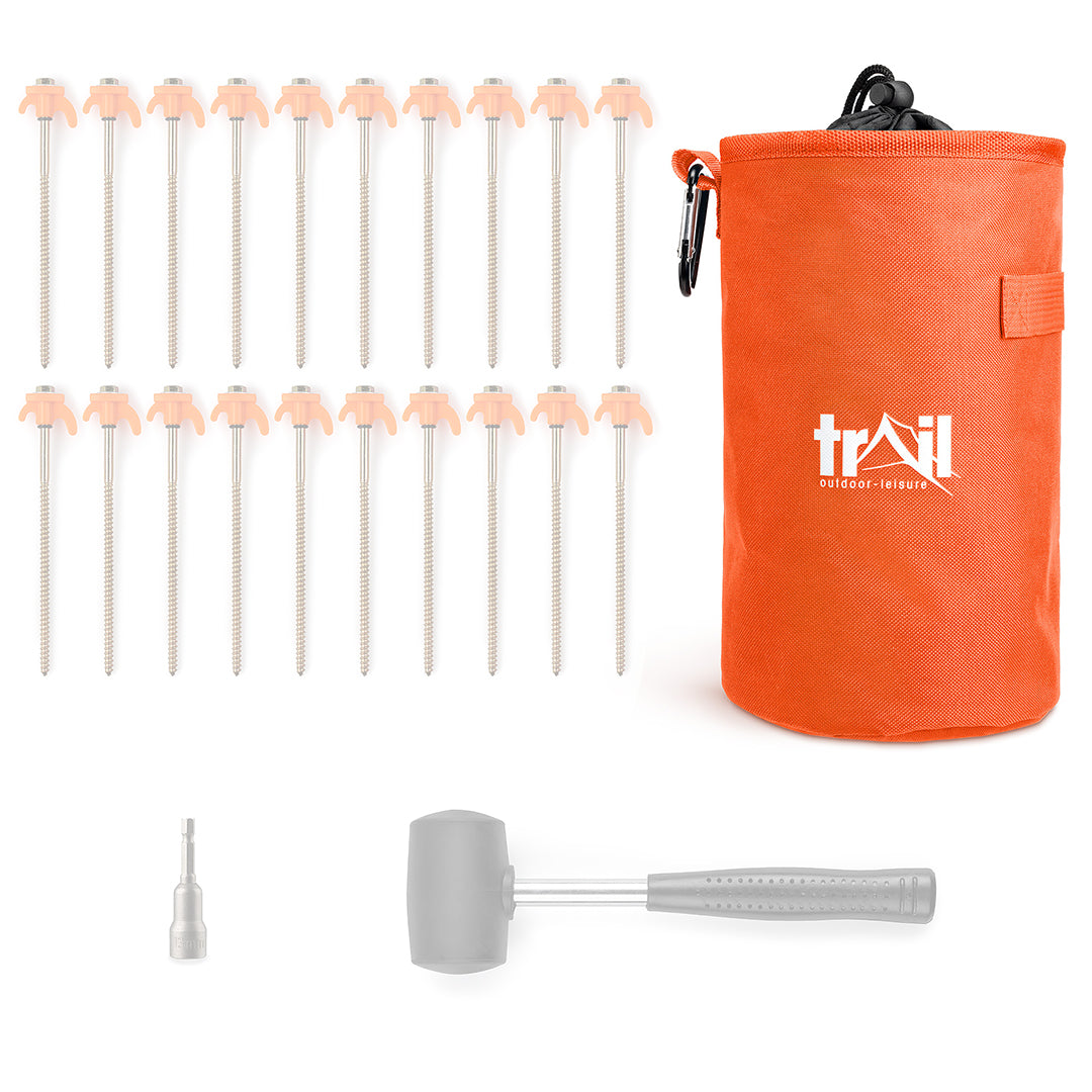 - 20 x Screw In Tent Pegs (screwable into the ground, making them perfect for stony ground and hard standing gravel pitches).