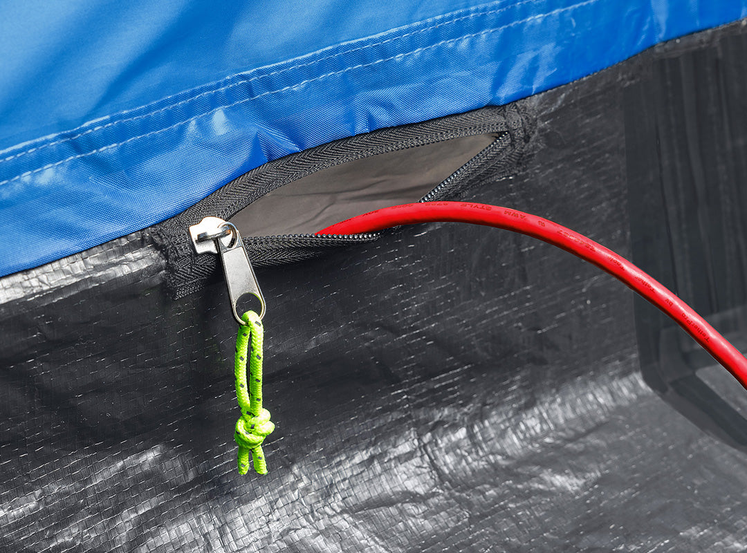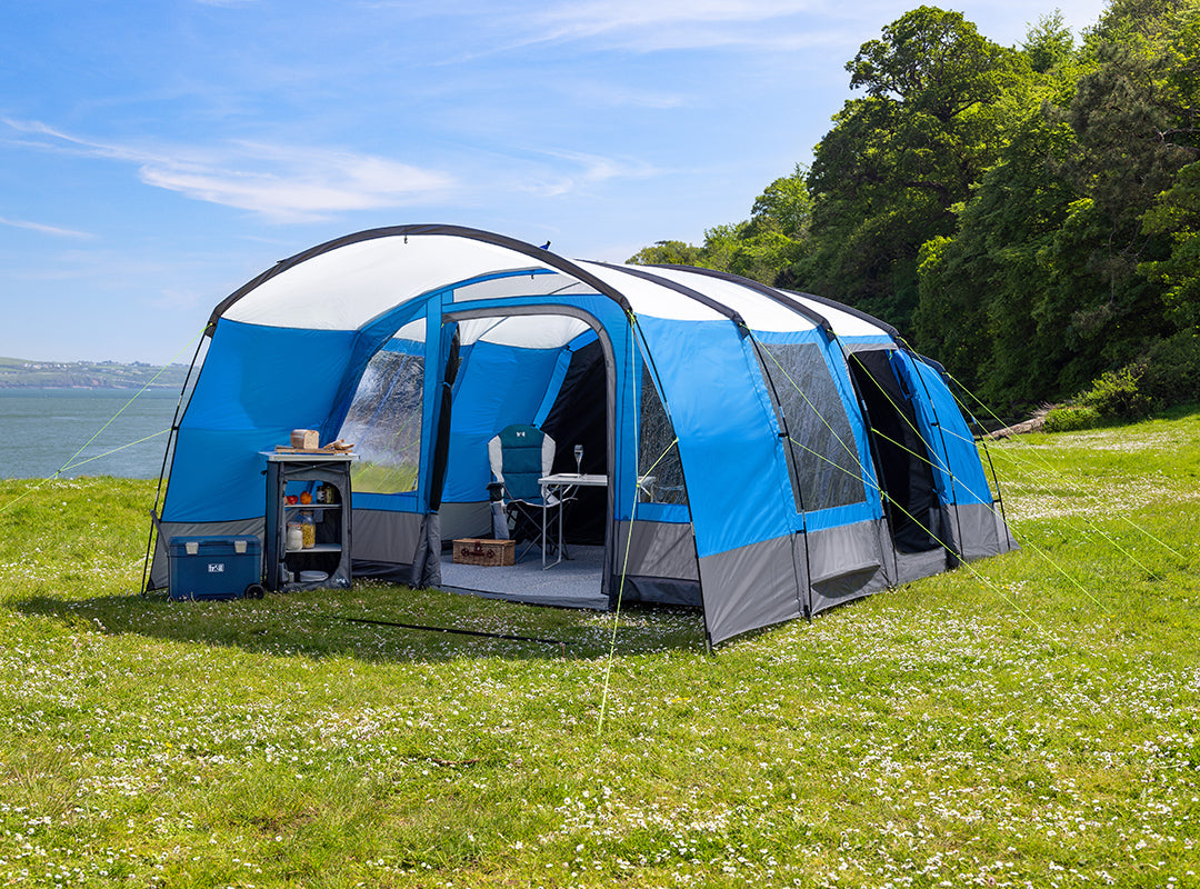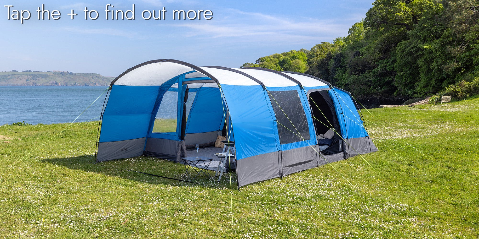 - Standing height living area with sewn-in groundsheet, zip entrance, zip side door, front and side windows with curtains, lantern hooks, cable access, and advanced vent system.
