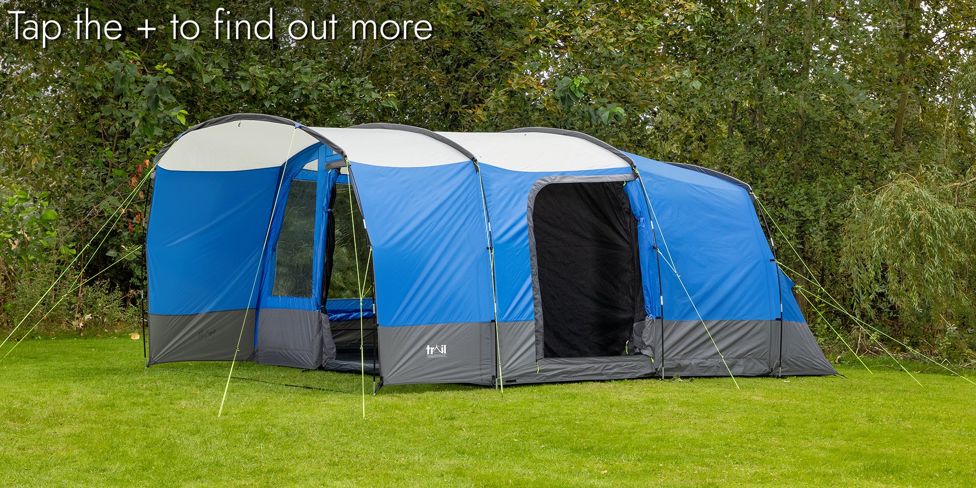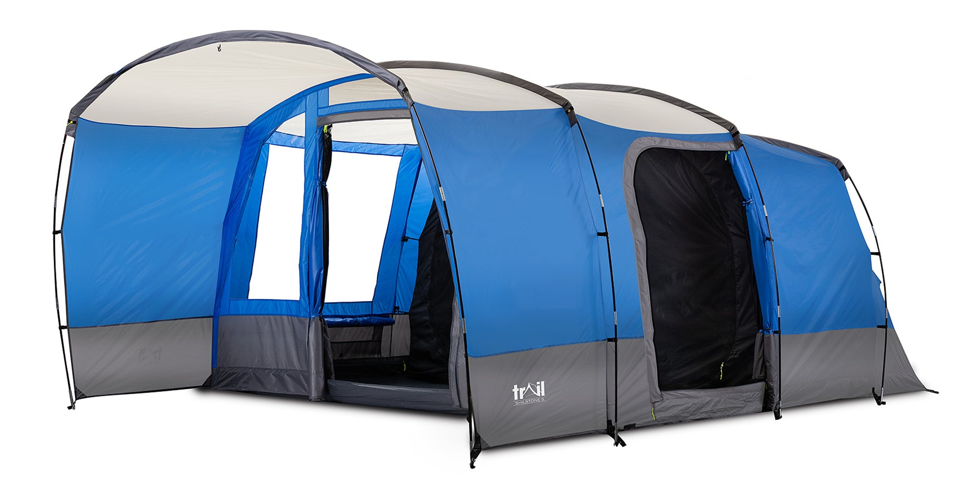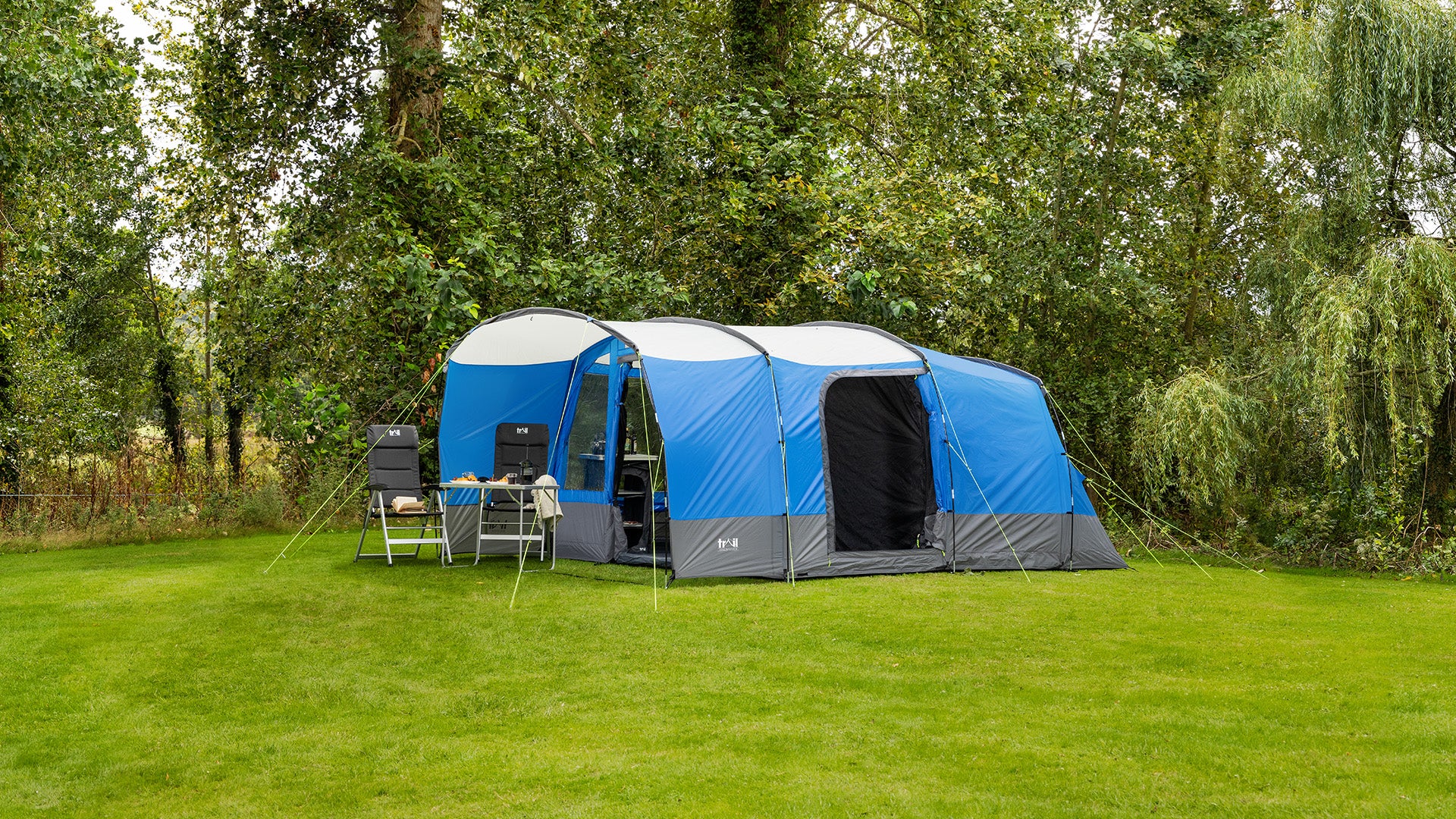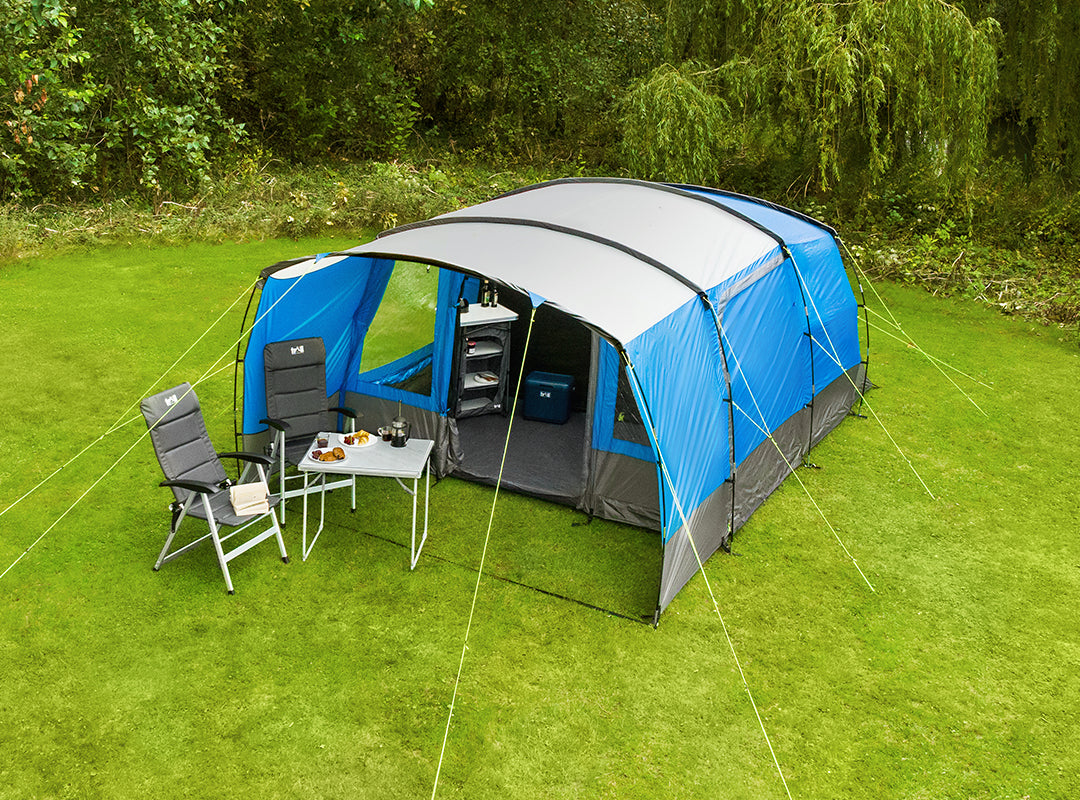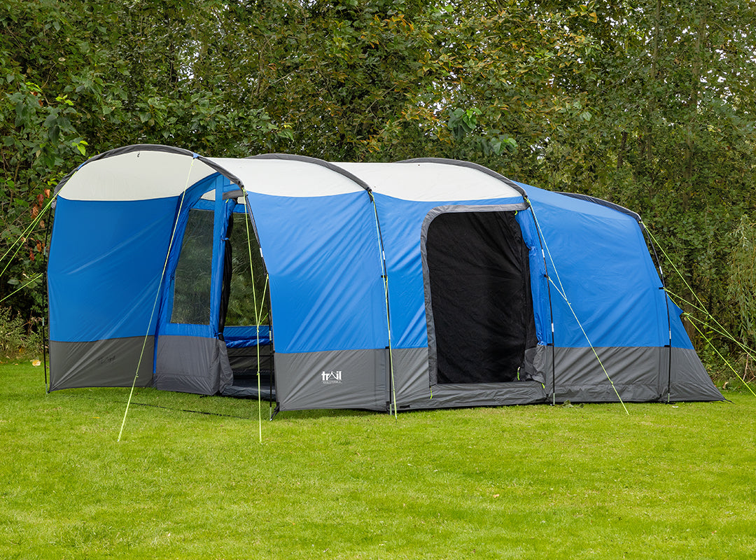 - Shilstone 3 Zone 5 Man Tent with angled fibreglass poles for extra width and height. Measures L515cm x W330cm x H200cm with a five-berth bedroom, living area, and awning.