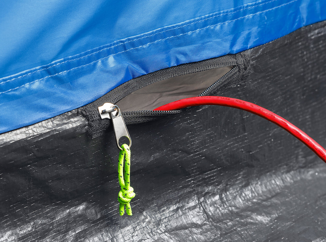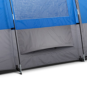- Standing-height living area features zipped front and side doors with secondary mesh doors, plus a sewn-in groundsheet, side window with curtain, ceiling hooks, cable access, and vent.