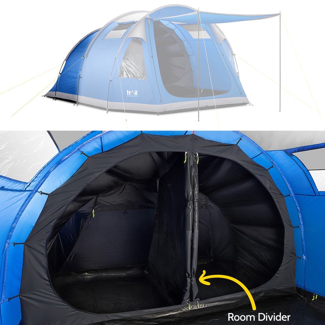 - Easy-pitch Tunnel Tent with Dark Zone bedroom to significantly block out sunlight and enjoy a more relaxing sleep (comfortably sleeps 4, but big enough for 5).